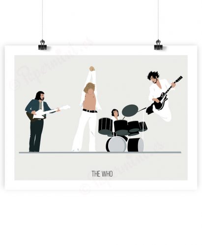 Póster con ilustración personalizada y minimalista de uno de los momentos de la actuación en directo de The Who en la Universidad de Leads en 1970.